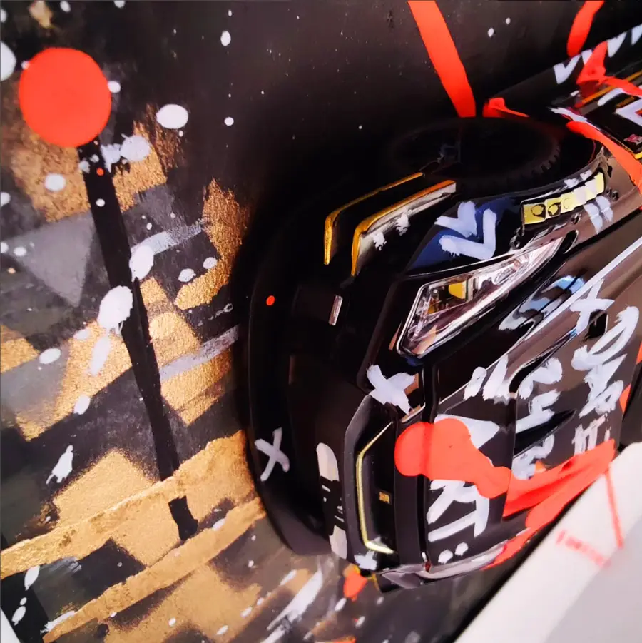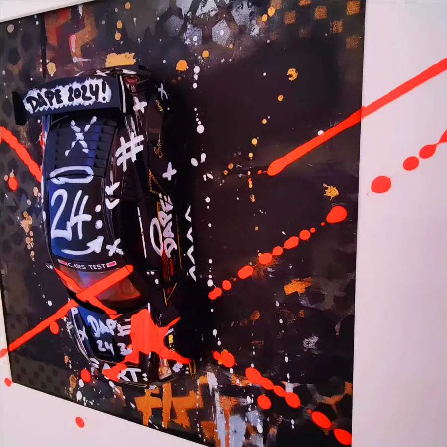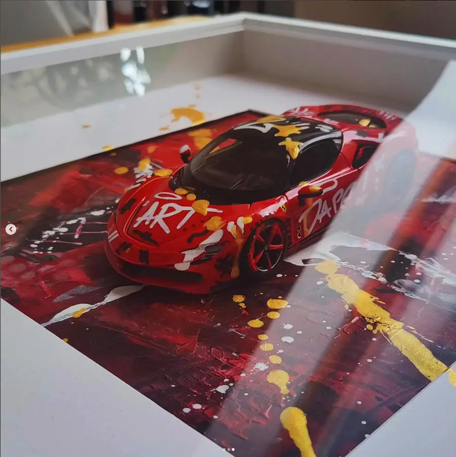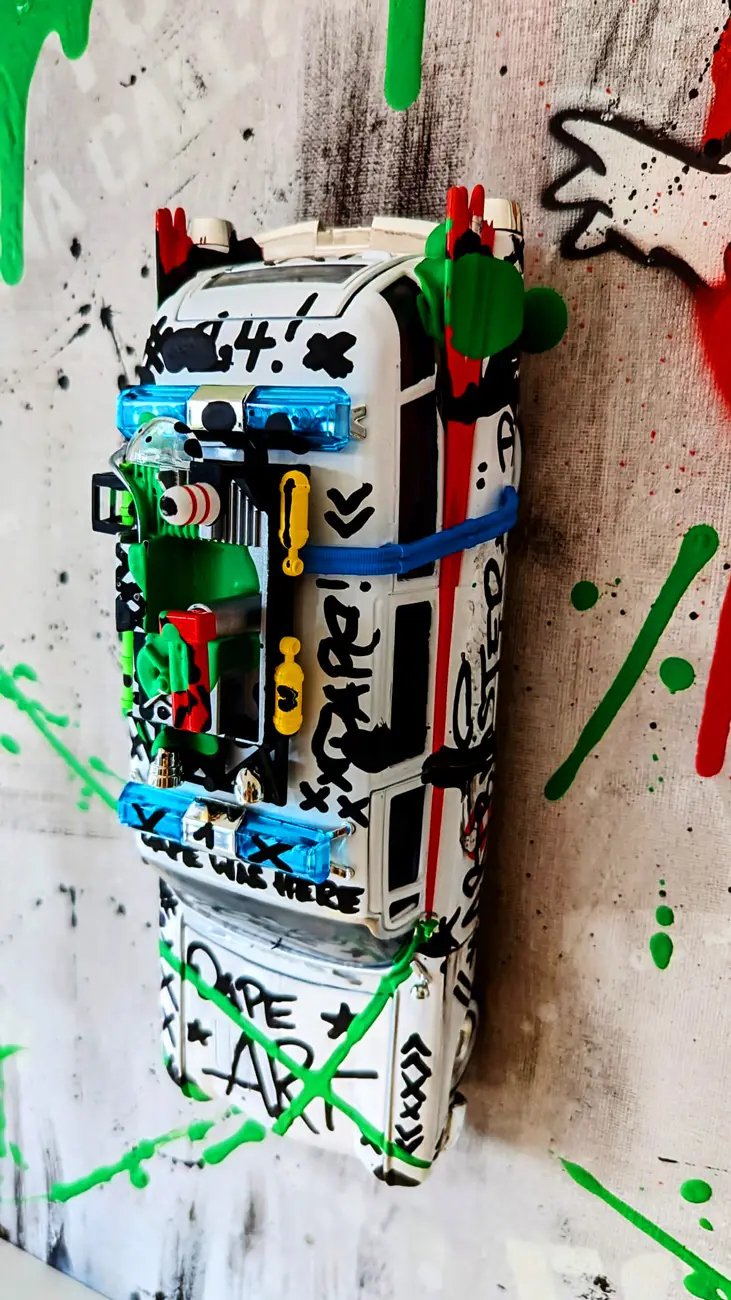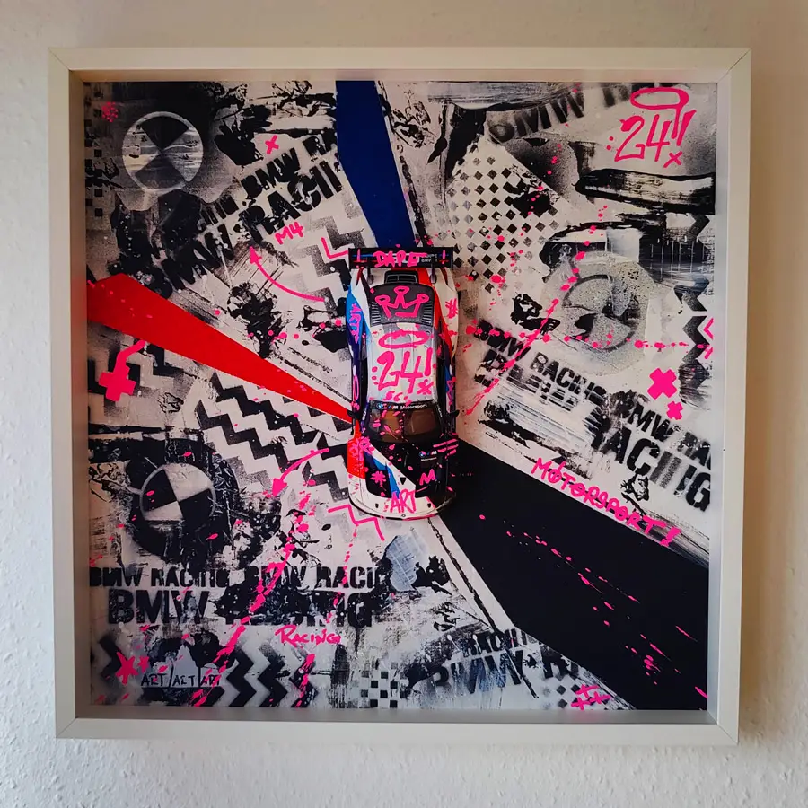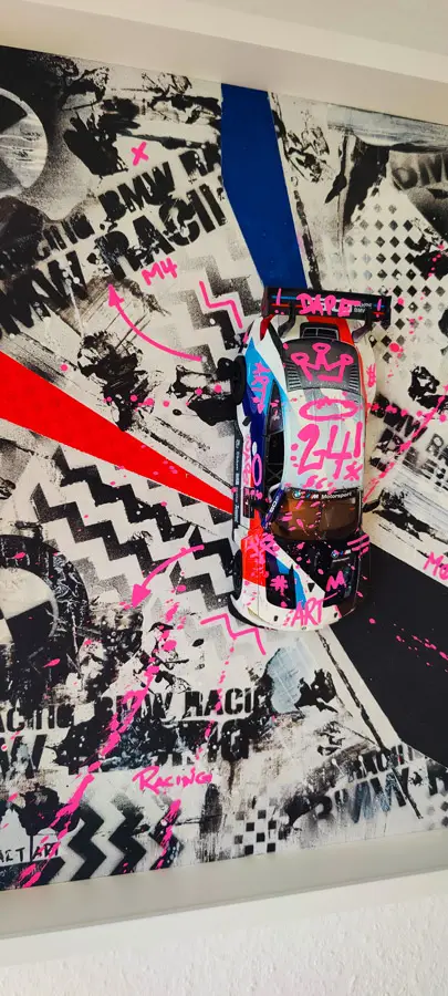 Meine gerahmten Einzelserien sind auf zehn Exemplare limitiert und exklusiv in der Galerie Elwert in Karlsruhe erhältlich. Diese Werke bestechen durch ihren 3D-Effekt, der durch folierte Scheiben entsteht. Ein weiteres Highlight sind meine gerahmten Unikate von 1:24 Modellfahrzeugen. Diese Einzelanfertigungen setzen aktuelle Supercars, Klassiker und Filmautos perfekt in Szene, kombiniert mit Graffiti- und Acrylelementen. Seit 2024 biete ich personalisierte Mixed Media Unikate an, die speziell für Firmen, Vereine oder leidenschaftliche Kunstliebhaber gestaltet werden. Diese individuellen Kunstwerke spiegeln Persönlichkeit und Geschichte wider.