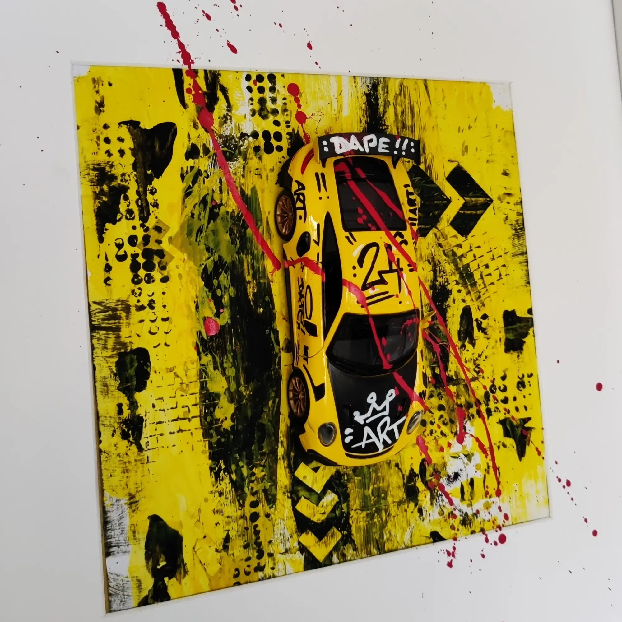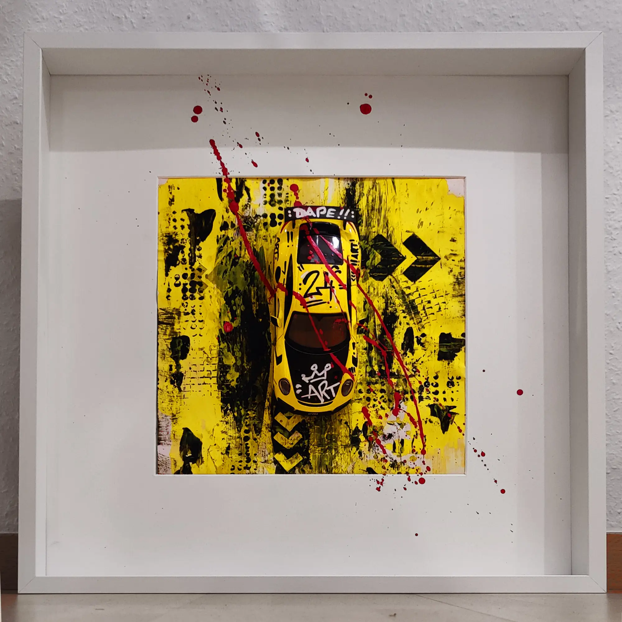 Gerahmt in 50x50cm, teils mit oder ohne Plexiglasabdeckung, stehen in diesen Kunstwerken die 1:24 Modellautos im Vordergrund. Mit Grafitti und Acrylelementen werdensie so perfekt in Szene gesetzt. Diese Werke sind je nach Seltenheit der Fahrzeuge ab 299€ zu erhalten.